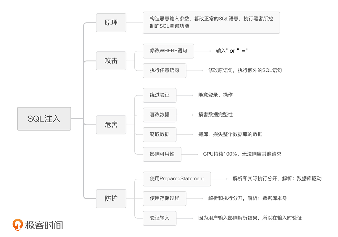 在认识到SQL注入的危害之后,我们知道,一个简单的SQL查询逻辑,能够带来巨大的安全隐患。因此,我们应该做到在开发过程中就避免出现SQL注入漏洞。那具体应该怎么做呢?接下来,我会为你介绍3种常见的防护方法,它们分别是:使用PreparedStatement、使用存储过程和验证输入。接下来,我们一一来看。